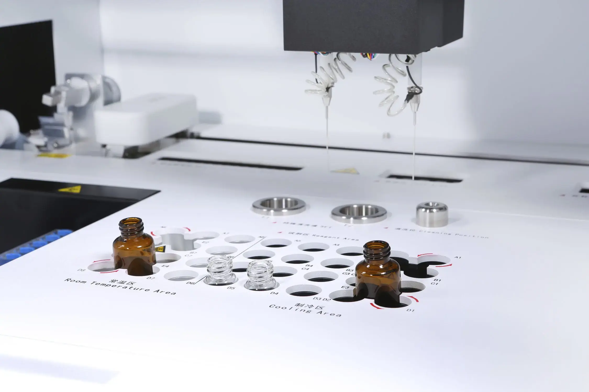 2) Sonde - 2 sondes : Sonde d'échantillon avec fonction de capteur de liquide. Sonde de réactif avec fonction de capteur de liquide et fonction de chauffage instantané.