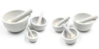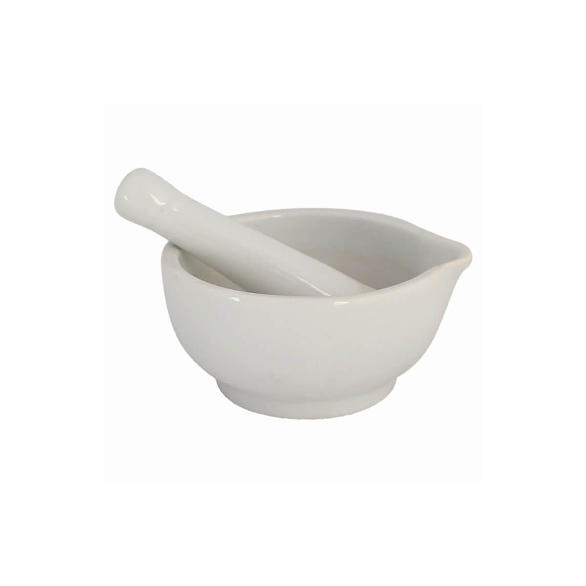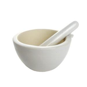 Mortier de porcelaine de laboratoire de 100 mm et de 160 mm de diamètre avec intérieur non émaillé. Équipé d'un pilon de 110 mm de long.