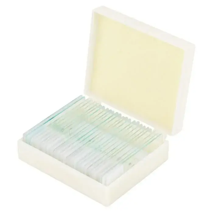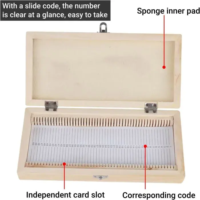 Boîte de rangement avec 50 emplacements pour maintenir les porte-objets de microscope en toute sécurité.